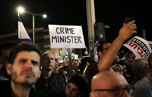 بین الاقوامی میڈیا رپورٹس کے مطابق اسرائیلی دارالحکومت تل ابیب میں ہزاروں افراد وزیراعظم کی کرپشن کے خلاف سڑکوں پر نکل آئے اور نیتن ہاہو کو بددیانت قرار دیتے ہوئے’ کرائم منسٹر‘ گھر جاؤ کے نعرے لگاتے رہے۔ مظاہرین نے وزیراعظم سے مستعفی ہونے کے مطالبے کے حوالے سے دستخط بھی کیے۔