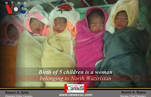 شمالی وزیرستان کے علاقے دتہ خیل دتہ خیل کےرہائشی حذب اللہ خان اپنی بیوی کو تشو یشناک حالت میں بنوں نجی کلینک لائے، خاتون نے کلینک میں 5 بچوں کو جنم دیا، نومولود بچوں میں چار بیٹیاں اور ایک بیٹا شامل ہے، گھر میں 5 بچوں کی ولادت پر بچوں کے والدین اور خاندان والے بہت خوش ہیں جب کہ ڈاکٹرز کا کہنا ہے کہ ماں اور بچوں کی حالت خطرے سے باہرہے۔ 4 روز قبل لاہور کے علاقے منڈی احمد آباد کی رہائشی خاتون نے لیڈی ایچی سن ہسپتال میں 5 بچوں کو جنم دیا تھا، نوزائیدہ بچوں میں تین بیٹے اور دو بیٹیاں شامل تھے۔
