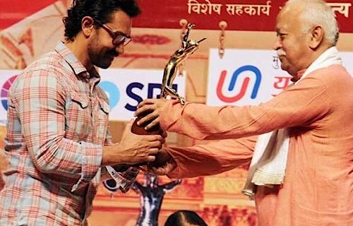 عامر خان کوتقریب میں فلم ’’دنگل‘‘ کے لیے ماسٹر دینا ناتھ منگیشکرایوارڈ دیا گیا لیکن دلچسپ بات یہ ہے کہ عامر خان کو یہ ایوارڈ انہیں غدار قرار دینے والی جماعت راشٹریہ سویم سیوک سنگھ( آرایس ایس) کے سربراہ موہن بھاگوت نے اپنے ہاتھوں سے دیا جس پر فلمی و سیاسی حلقے بھی حیران ہیں۔