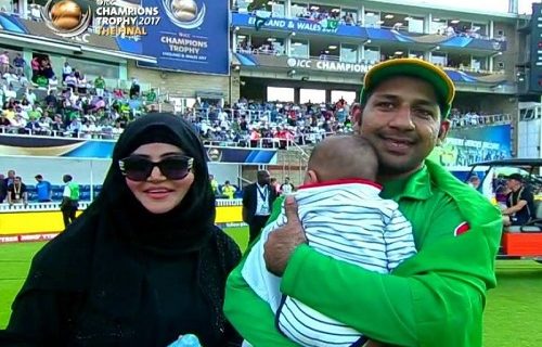 فتح کے بعد سرفراز احمد اپنی اہلیہ اور بچے کے ہمراہ اوول کے میدان میں