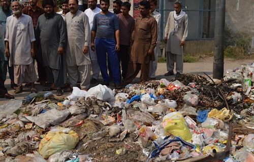 گل روڈ اکرم کالونی اور قیوم کالونی کے وسط میں اور لیبر کوٹ کی گلی کے سامنے مین روڈ پر گزشتہ 2 ماہ سے زیادہ یہاں کوڑے کے انبار لگے ہوئے ہیں جس کو علاقہ کے مکینوں نے آگ لگا کر کم کرنے کی کوشش کی گئی ہے لیکن شام تک پھر اتنا کوڑا اور ہو جاتا ہے، علاقہ مکینوں نے میڈیا سے بات کی اور بتایا کہ ہمارے بچے بیمار ہو رہے ہیں اب تو ہم تنگ آچکے ہیں اور اج پرامن احتجاج کر رہے ہیں ،