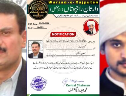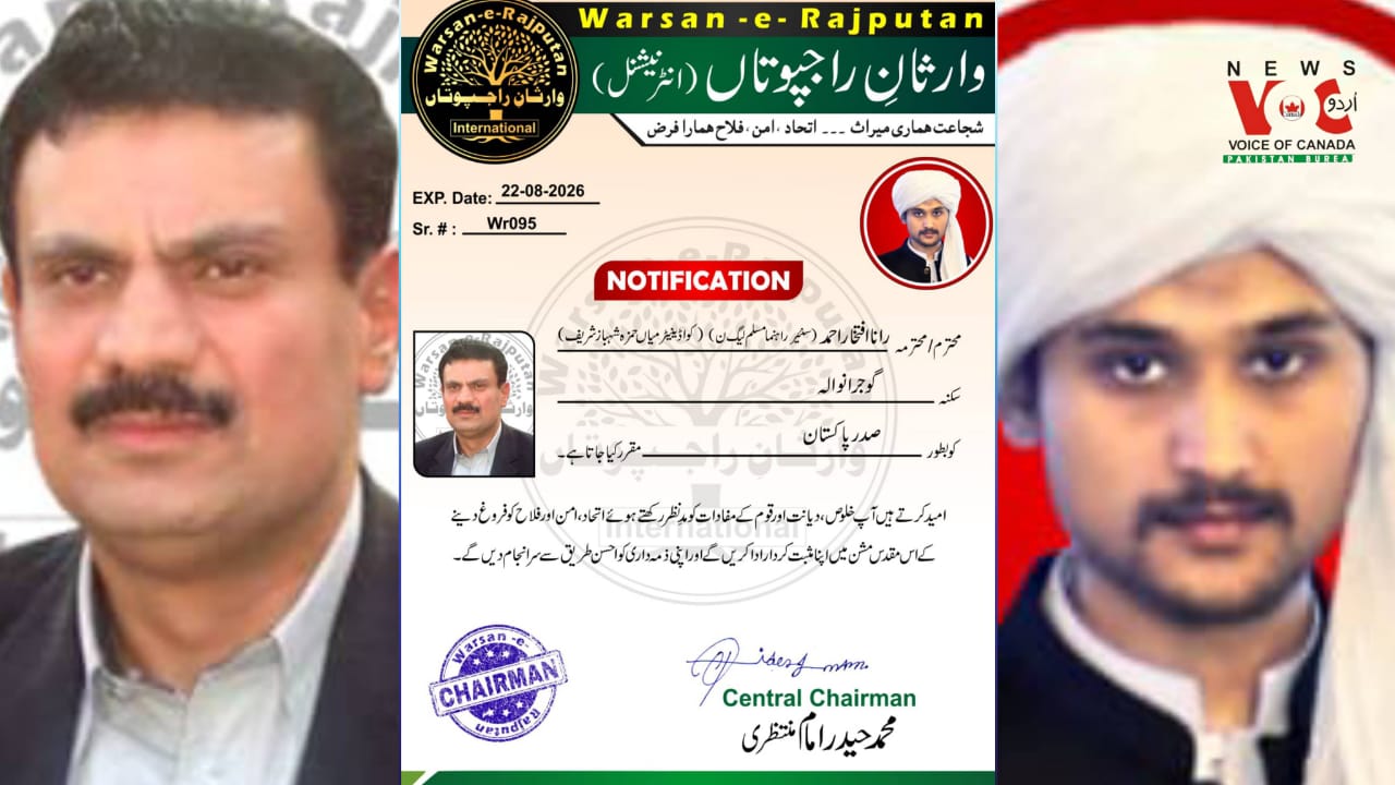 نیشنل، نیوز ڈیسک گوجرانوالہ، پاکستان وارثانِ راجپوتاں انٹرنیشنل نے رانا افتخار احمد کو صدر پاکستان نامزد کردیا وارثانِ راجپوتاں انٹرنیشنل نے ایک باضابطہ نوٹیفکیشن جاری ..مزید پڑھیں
